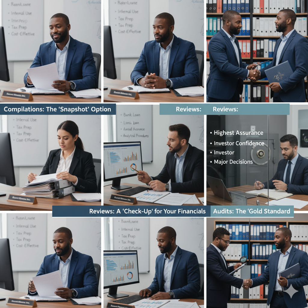 Running a business means juggling a lot—clients, employees, deadlines, and finances. When it comes to financial reporting, many small business owners feel the pressure to “get it right” while also staying focused on running the business. The question often comes up: Do I need a compilation, a review, or a full audit?