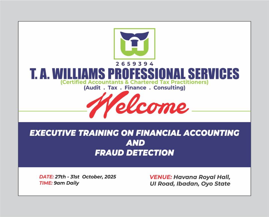 Ibadan, Nigeria – October, 2025 – T.A. Williams Professional Services has successfully organized a comprehensive two-day training programme on Financial Accounting and Detecting Fraud for Directors and Heads of Departments of the Federal Ministry of Finance. The impactful session, held at Ibadan, marked another milestone in the firm’s commitment to advancing professional excellence and accountability in Nigeria’s public finance sector.